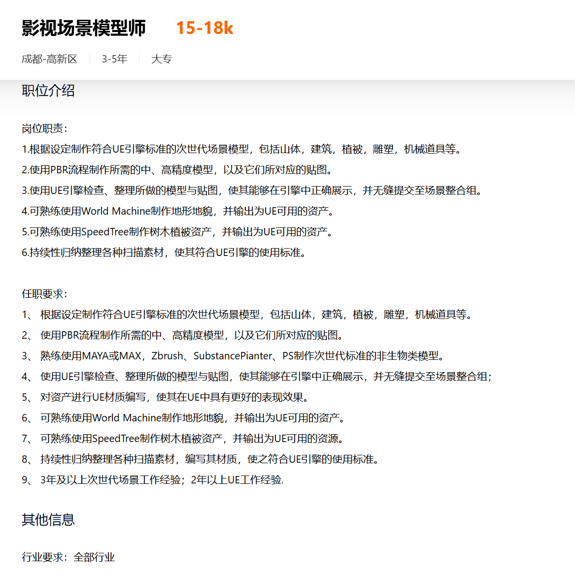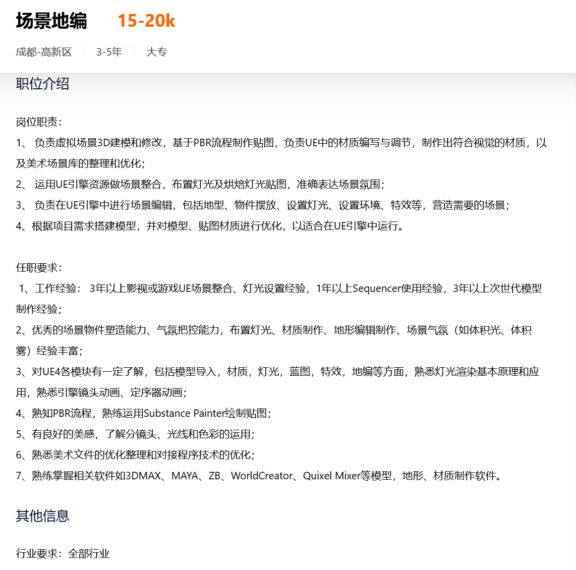 纵观艾尔平方这次招聘不难发现,对3D特效师的需求尤为突出,UE5引擎、实时渲染等技术成为岗位硬性要求。