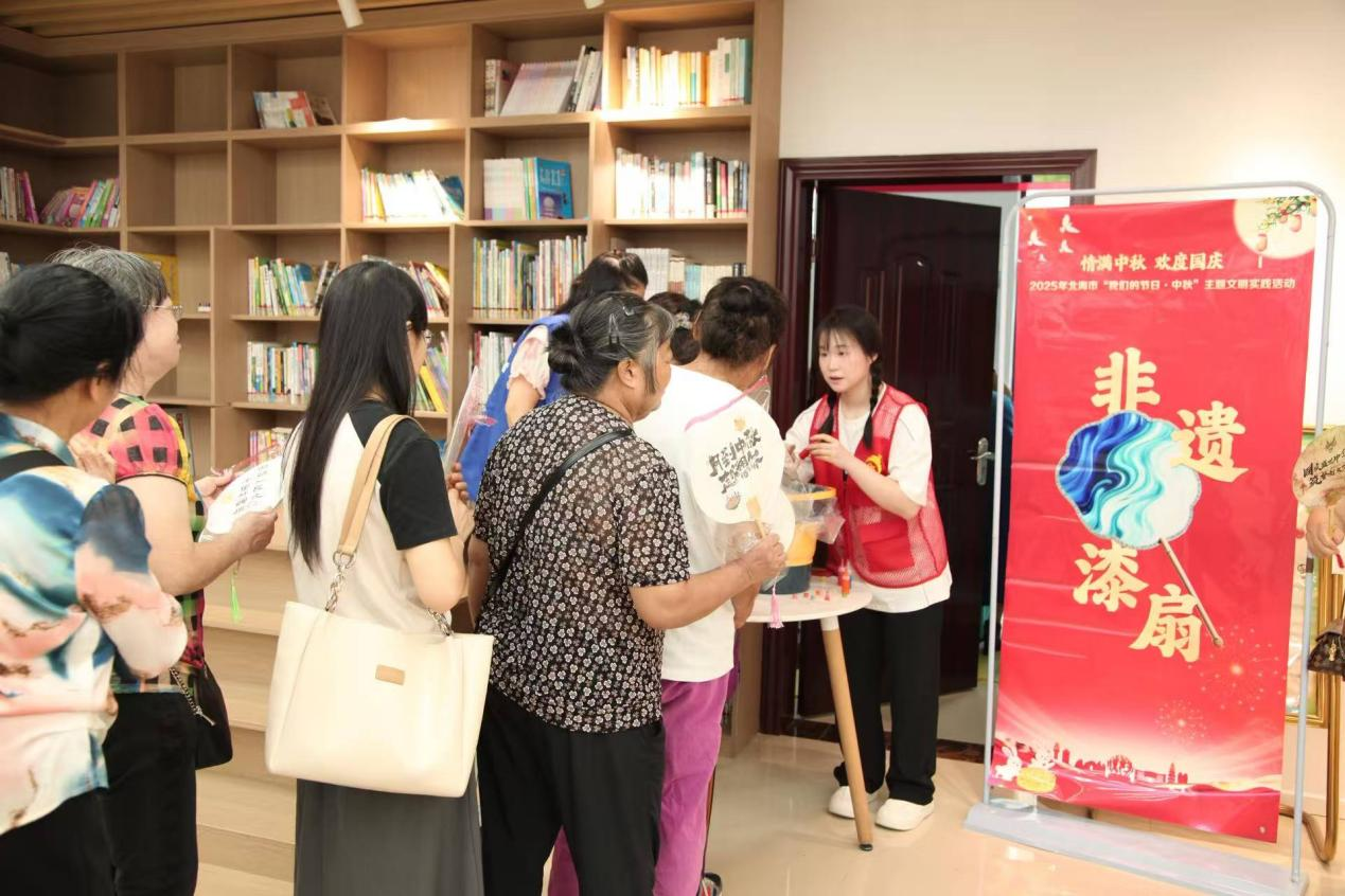 2025年北海市“我们的节日·中秋”主题文明实践活动9月29日上午在茶亭路社区热闹开启。本次活动以“情满中秋 欢度国庆”为主题,文学院志愿者全程主导服务,通过非遗展演、手工体验、趣味互动等丰富形式,为社区老年居民精心呈现了一场融合文化底蕴与节日温馨的双节盛宴。