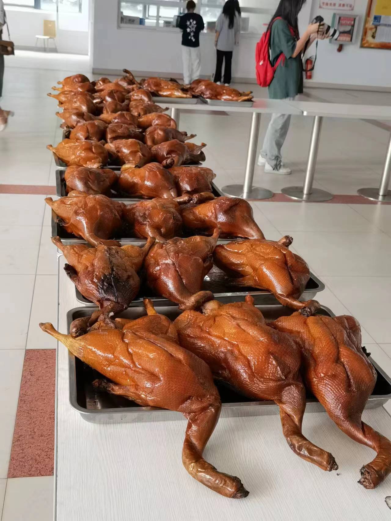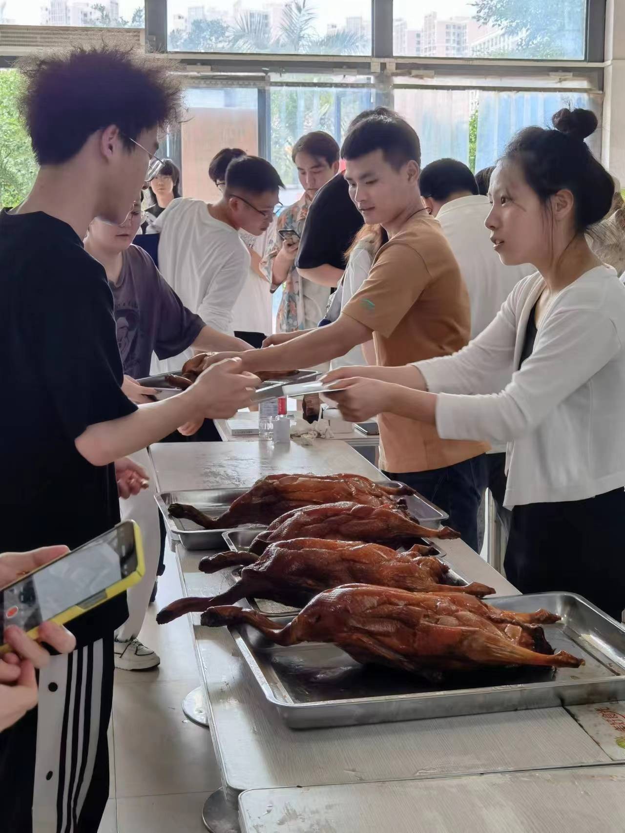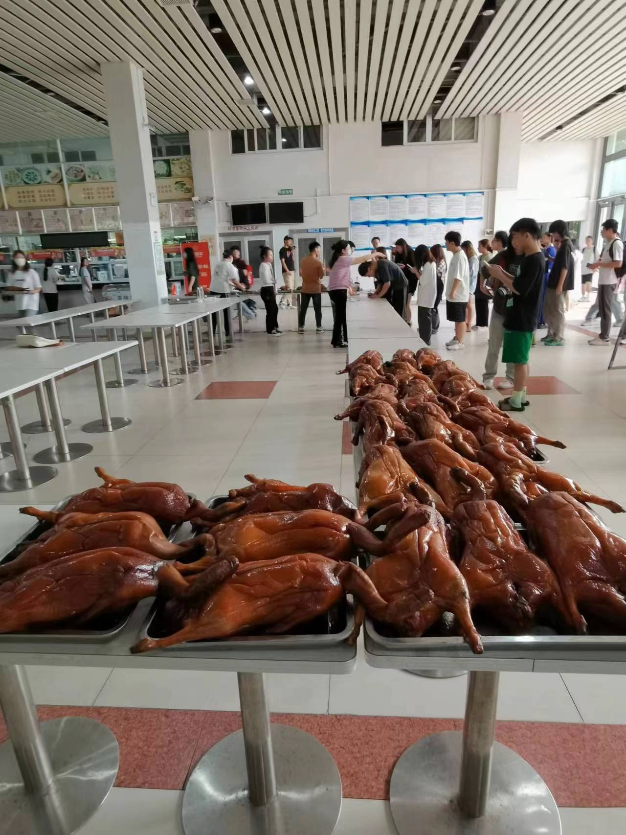 学校于4月24日在食堂给学生发放烧鹅福利,同学们井然有序排队领取着,工作人员有条不紊忙碌着。(林礼凤/摄)