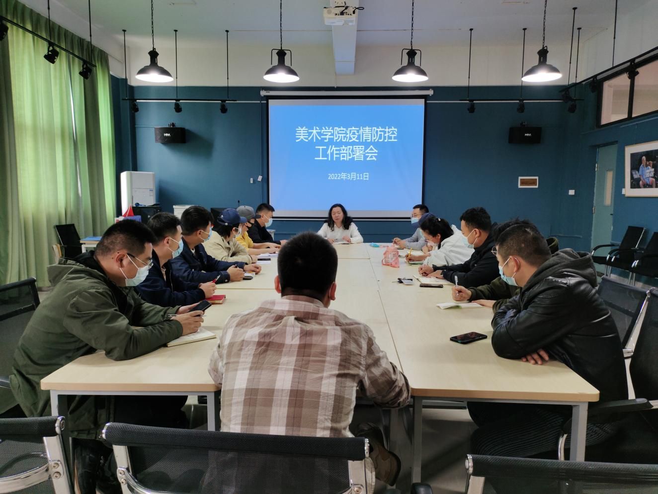 2022年03月11日,周五,天气晴。中午12点,在艺术楼313工作室召开美术学院美术学院疫情防控工作部署会,会议由副校长胡胜主持。