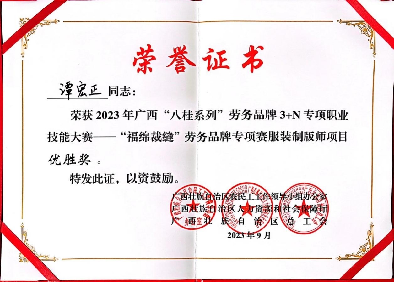 经过选手们激烈的角逐,裁判组严格认真的评审,我校教师谭宏正获得服装制版师优胜奖,学生谭春李获得缝纫工优胜奖