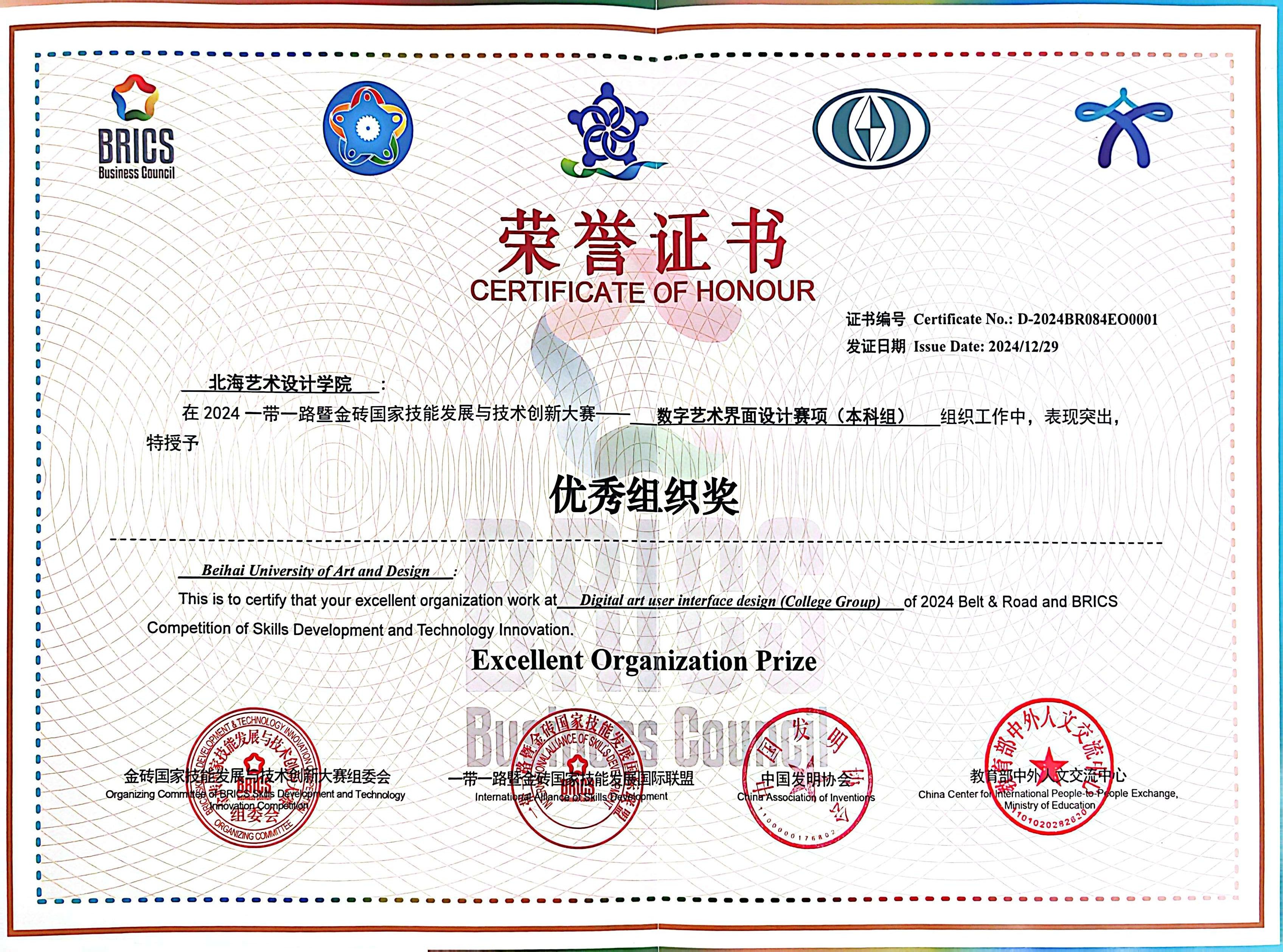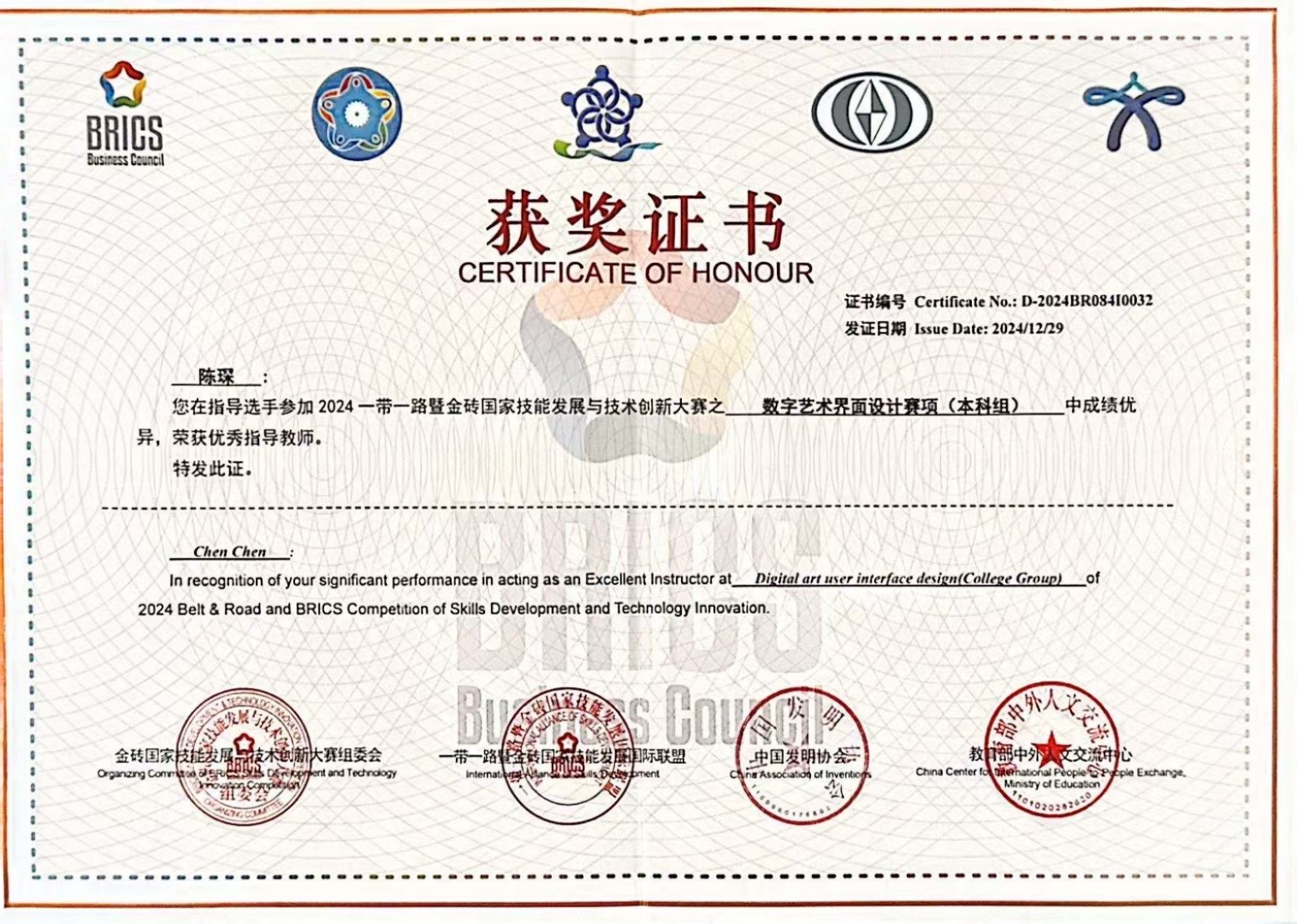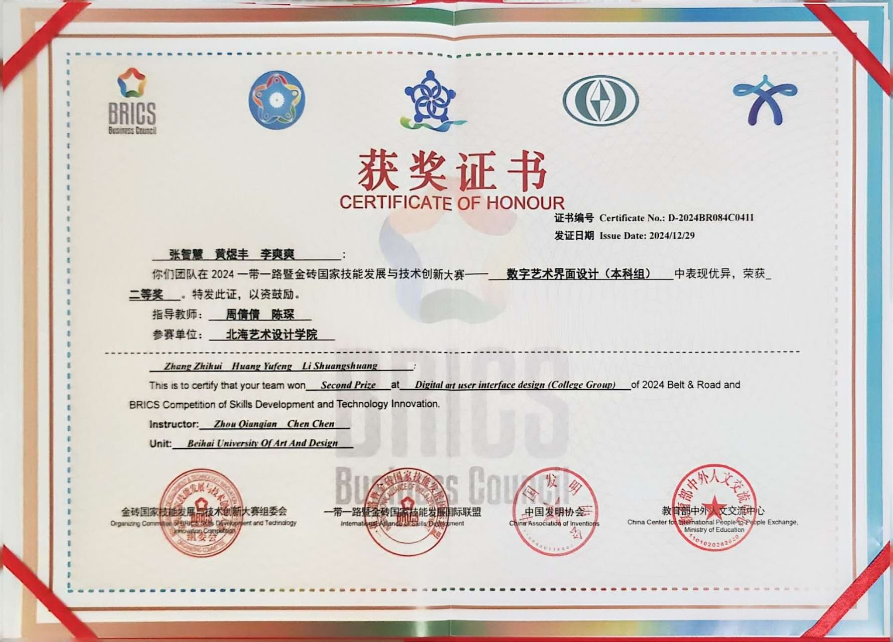 一带一路暨金砖国家技能发展与技术创新大赛是教育部官方认证的国家级A类学科竞赛本届赛事——数字艺术界面设计赛项旨在响应《国家“十四五”数字经济发展规划》及“一带一路”倡议,深化产教融合,推动人工智能与艺术设计的跨界创新吸引了全球200余所高校、超千名选手同台竞技,院师生凭借前沿技术应用与创新设计思维脱颖而出,荣获国家级二等奖1项,国家级优秀奖2项,大赛“优秀组织奖”1项,两名教师获“优秀指导教师”,彰显了学院在AI时代“数智化转型”的教学成效