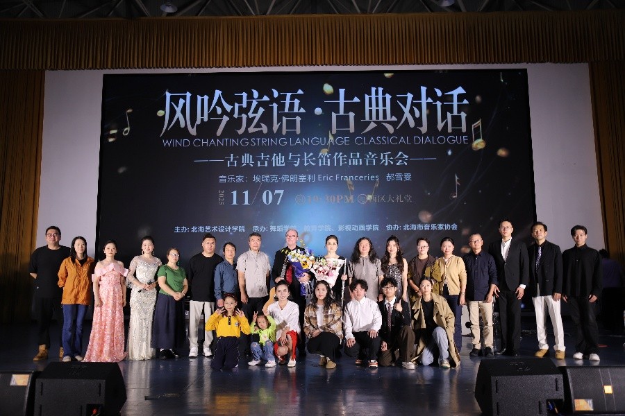 由北海艺术设计学院主办,学校舞蹈学院、教育学院及影视动画学院联合承办,北海市音乐家协会协办的“风吟弦语・古典对话”古典音乐盛宴,于11月7日在我校西校区大礼堂举行。法国古典吉他演奏家埃瑞克・佛朗塞利与旅法长笛演奏家郝雪雯联袂登台,学校常务副校长胡胜、副校长邱杰、总督学王斌,师生代表及社会各界嘉宾齐聚现场,沉浸式领略这场兼具专业深度与艺术感染力的听觉盛宴。