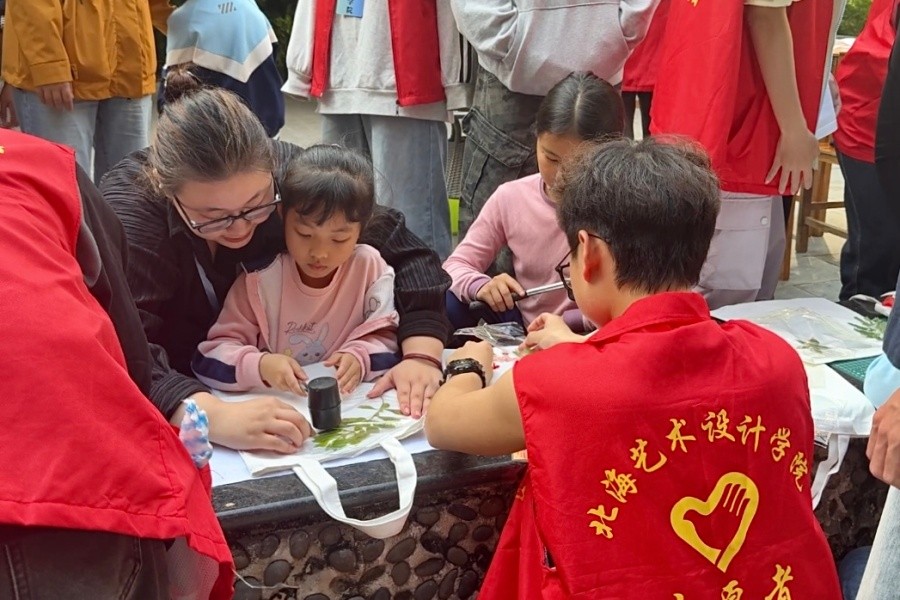 活动现场设置了植物拓染手工体验区、漆扇创作手工体验区及社区志愿服务工作组,学生志愿者分工明确、协同配合,保障活动高效推进。两大手工体验区开放后,迅速成为居民参与热点。前期,志愿者已完成植物素材采集工作,筛选出形态多样的叶片、色彩清雅的雏菊及叶脉分明的梧桐叶等天然材料。活动期间,服装学院团总支书记陈琛围绕植物拓染技艺开展现场教学,向居民及青少年演示操作流程:将植物素材平铺于白布表面,通过轻柔捶打使植物天然色素在布料上自然晕染,形成独特纹样。亲子家庭积极参与,共同完成帆布包、纯棉手帕等文创作品制作。漆扇创作体验区同样人气高涨,志愿者为居民提供空白漆扇、颜料、画笔等工具,并结合传统纹样知识进行创作指导,助力居民完成专属漆扇作品,让参与者深度感受传统手工艺的文化魅力。